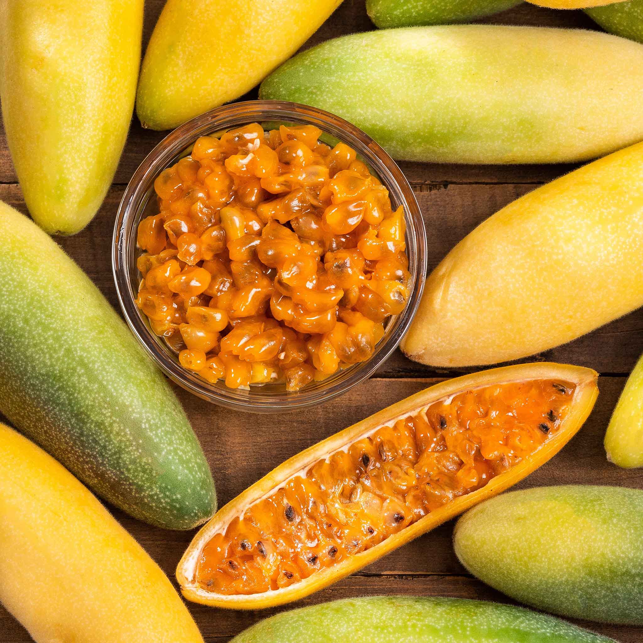 The edible fruits can be enjoyed fresh or used as flavoring for drinks. They are commonly used in South America to enhance the flavor of ice creams, beverages, and cocktails. The plants produce a yellow, oval shaped passion fruit with bright yellow skin and orange pulp that is very tasty!