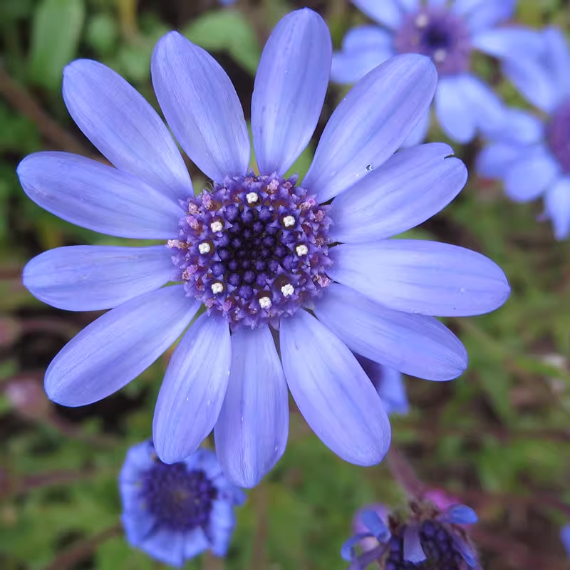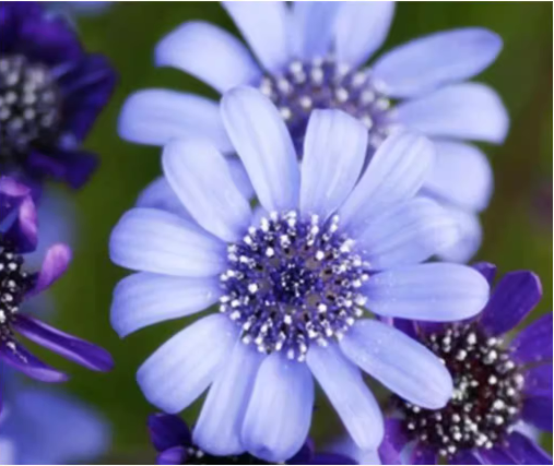 Tongue flowers light sky blue, tubular flowers cobalt blue. There is a consistent floret structure. Florets tubular, radially symmetrical, or ligulate and bilaterally symmetrical, or corolla tubular with lobes 2-lipped. Most of the florets are densely arranged, covered with involucral bracts to form a consistent flower head. The flower size is about 2cm in diameter, the flower center is yellow, and the petals are white or light blue.