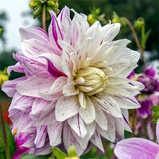 ‘Bonesta’ is a 4” white decorative dahlia with irregular pink stripes, each flower is unique and beautiful.