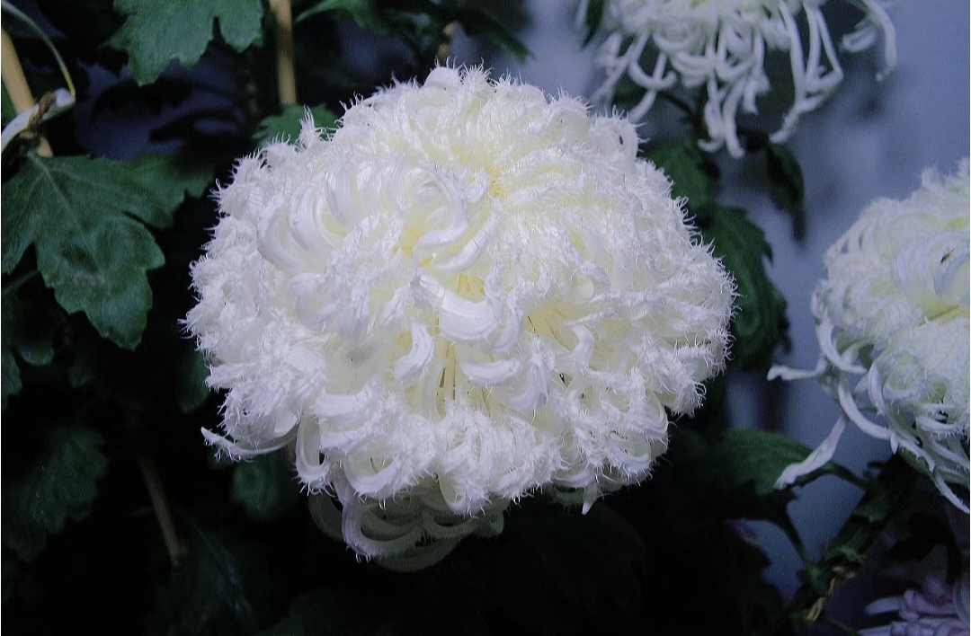 Chrysanthemum  or white burr, blooms like a ball of yarn with a very textured texture. White burr is the basic flower type of burr-like chrysanthemums, with white flowers and yellow centers, straight tubes with multiple rounds of petals in tongue-shaped flowers, and flat feet.