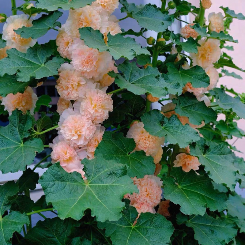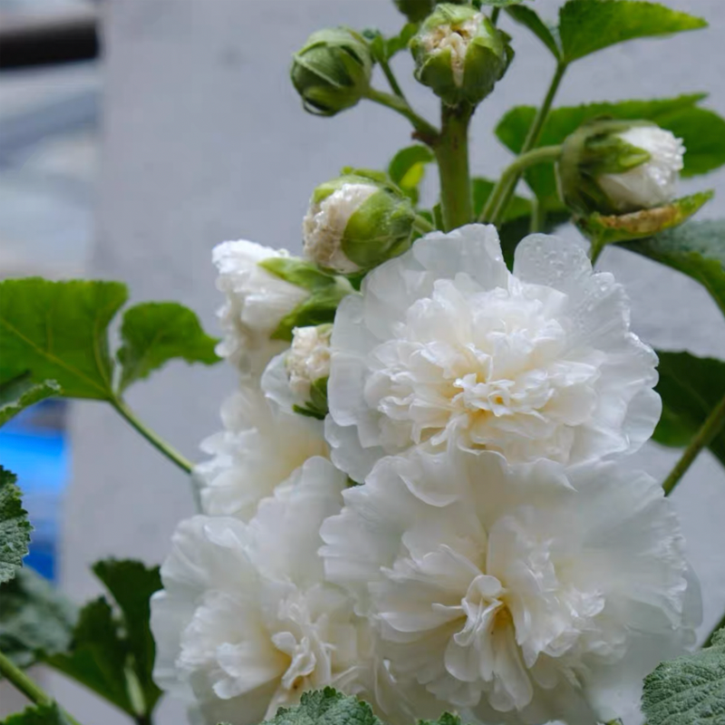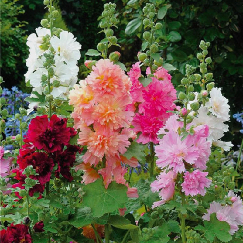Hollyhock is a hardy biennial flowering plant that produces fully-double scarlet, pink, white, purple, brown and yellow flowers on sturdy spikes.