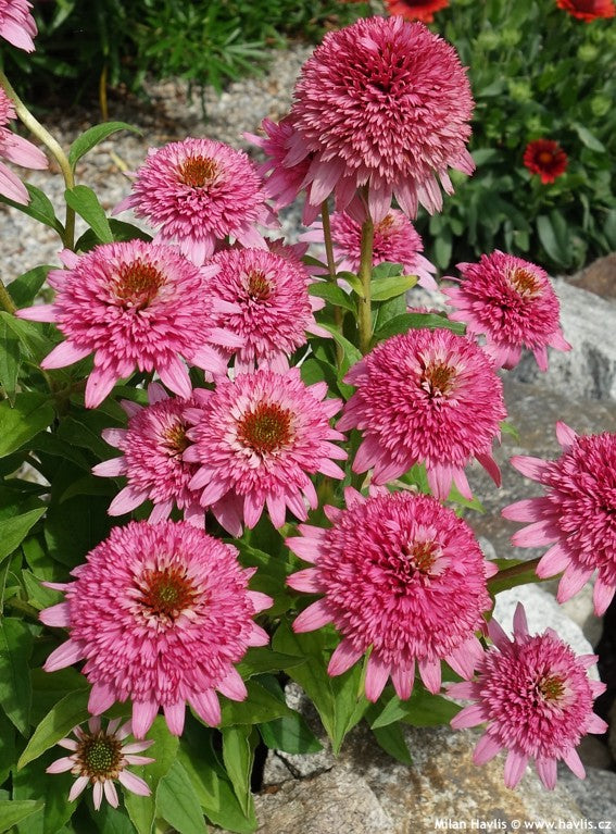 Noted for its compactness and sturdy habit, Echinacea purpurea 'Butterfly Kisses' is a particularly attractive double coneflower with large, fragrant, bright pink ray flowers, 3 in. across (7 cm), adorned with a darker pompom central cone. Well branched, its numerous flowering stems are strong and held upright. Blooming from midsummer until frost, this dwarf coneflower provides a vibrant floral display and is perfect for perennial borders, small gardens or patio containers. Can be used in fresh cut or dried arrangements.