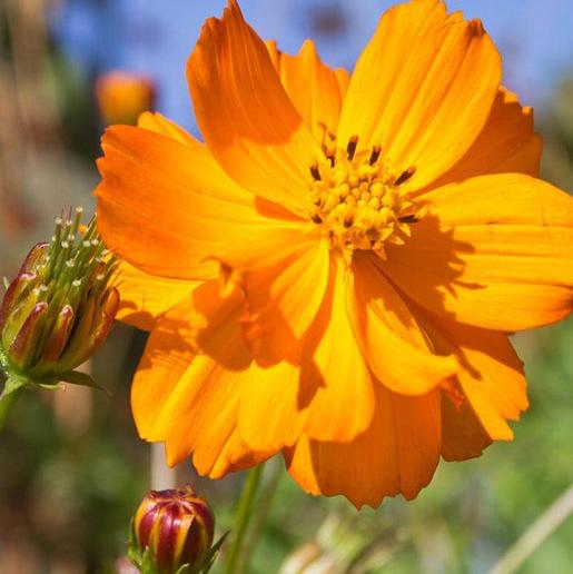 C. sulphureus.The intense dazzling yellow to reddish orange single flowers on this striking species Cosmos attracts bumblebees, birds, and beneficial insects, and looks terrific in a cut flower bouquet. Plant Bright Lights cosmos seeds in full sun. It's easy to grow in a variety of soils - tend towards the dry side. Its natural drought tolerance makes it a good candidate for xeriscaping. Plants grow to about 1m (3') tall, for the middle or front of a mixed border. Mix Bright Lights with dark blue and purple flowers for eye-catching contrast.