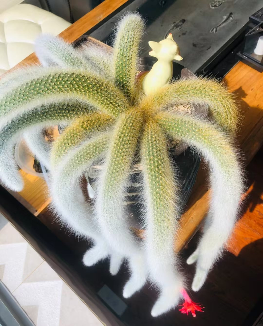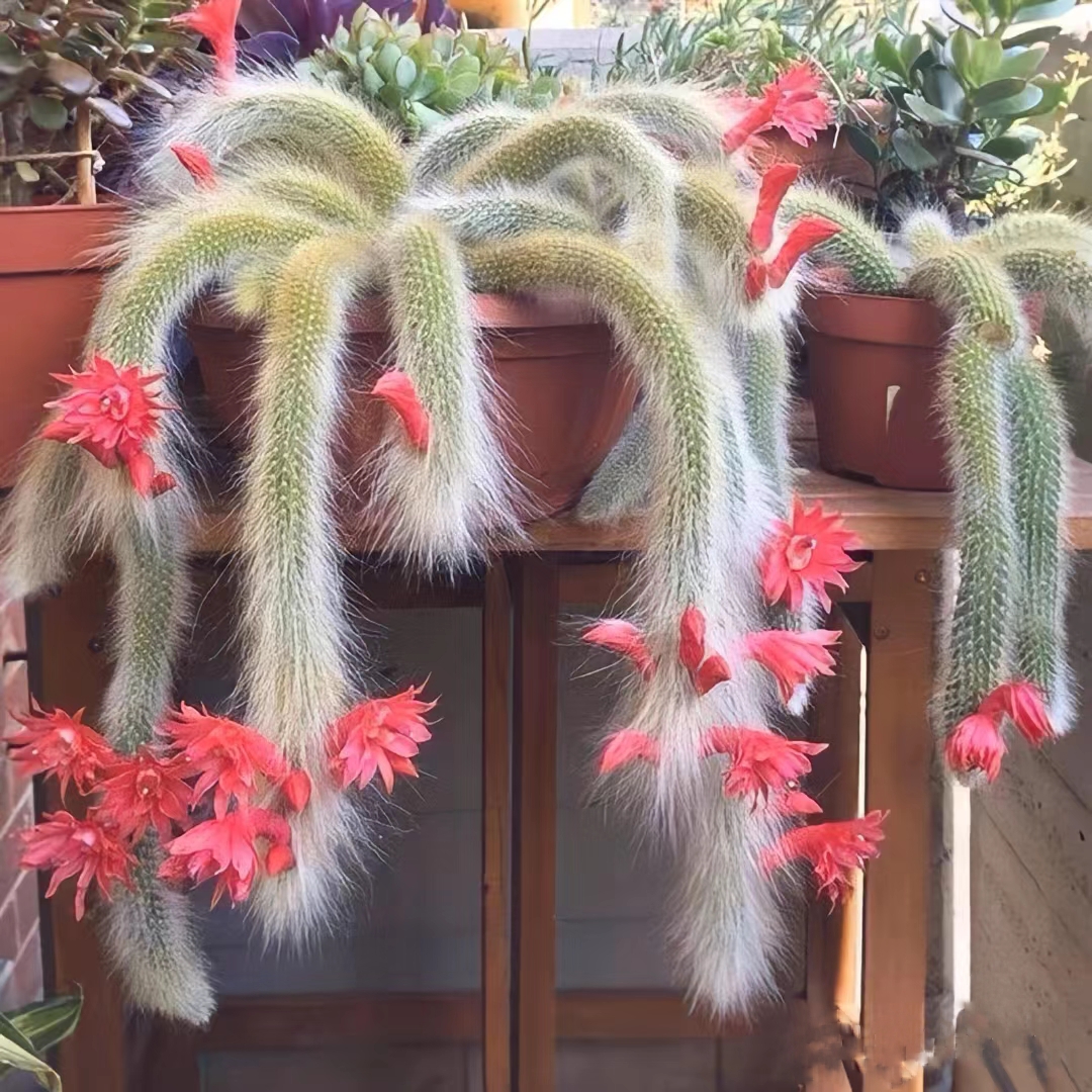 The Monkey’s tail cactus has a peculiar shape. The slender white hair column is similar to the tail of a monkey. It is free-flowering and the outsize bright red blooms are particularly decorative. It is an exotic succulent plant grown in USDA zones 9-11 reaching 12-18 inches in height. Monkey’s tail cactus is easy to grow and low-maintenance in sandy and loamy soils. With a little bit of patience, you can enjoy this wonderful plant for many years to come.